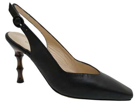 Black nappa slingback with leather covered buckle, wooden statement heel.